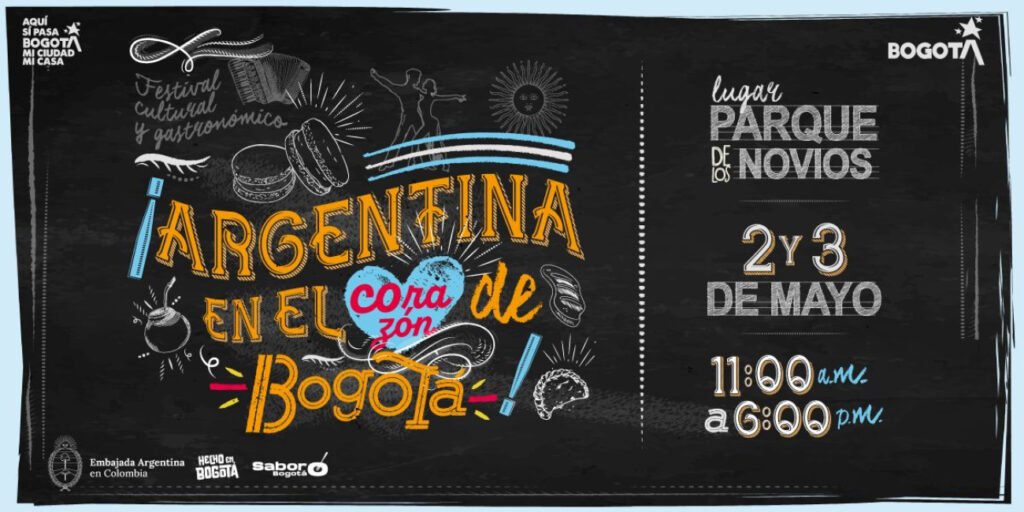 El festival ‘Argentina en el corazón de Bogotá’ será una gran fiesta al aire libre con música, danza, emprendimientos, literatura y comida en el Parque de los Novios, que invita a bogotanos, bogotanas y turistas a reunirse en torno a la diversidad. El 2 y 3 de mayo, desde las 11:00 de la mañana y hasta las 6:00 de la tarde, los asistentes podrán encontrarse con gran variedad de platos como empanadas, choripanes, alfajores, sándwiches, asados, entre otros productos como snacks, bebidas y postres. Además, habrá emprendimientos de moda, hogar y decoración, y alimentos empacados.