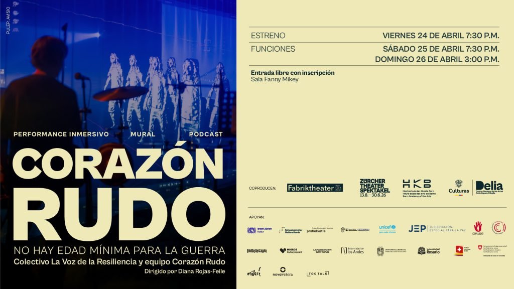 La programación cierra los días 24, 25 y 26 de abril con Corazón Rudo: No hay edad mínima para la guerra, performance inmersivo, mural y podcast del Colectivo La Voz de la Resiliencia y el equipo Corazón Rudo (Colombia/Suiza), dirigido por Diana Rojas-Feile, en la Sala Fanny Mikey.