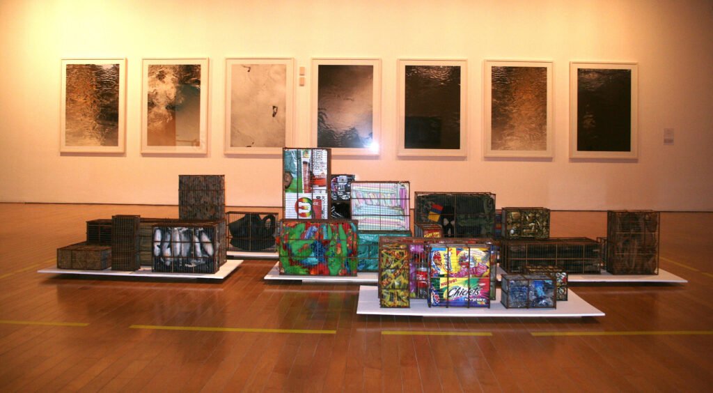 «DO  WABURA  DAI  BIA  OZHIRADA» (“ADIOS RIO QUE TANTO BIEN NOS HICISTE” traducción al español de la lengua Emberá-Katío). 1912 (creación colectiva liderada por Olga Gómez Angulo -1944 – 2023-, realizada con jaulas y depósitos para pájaros a manera de contenedores de gran variedad de artículos y desechos que, gracias a su cuidadosa selección se convierten en un inventario para la memoria colectiva, un archivo sin garantía de futuro, un ritual de simbologías de pérdidas…)