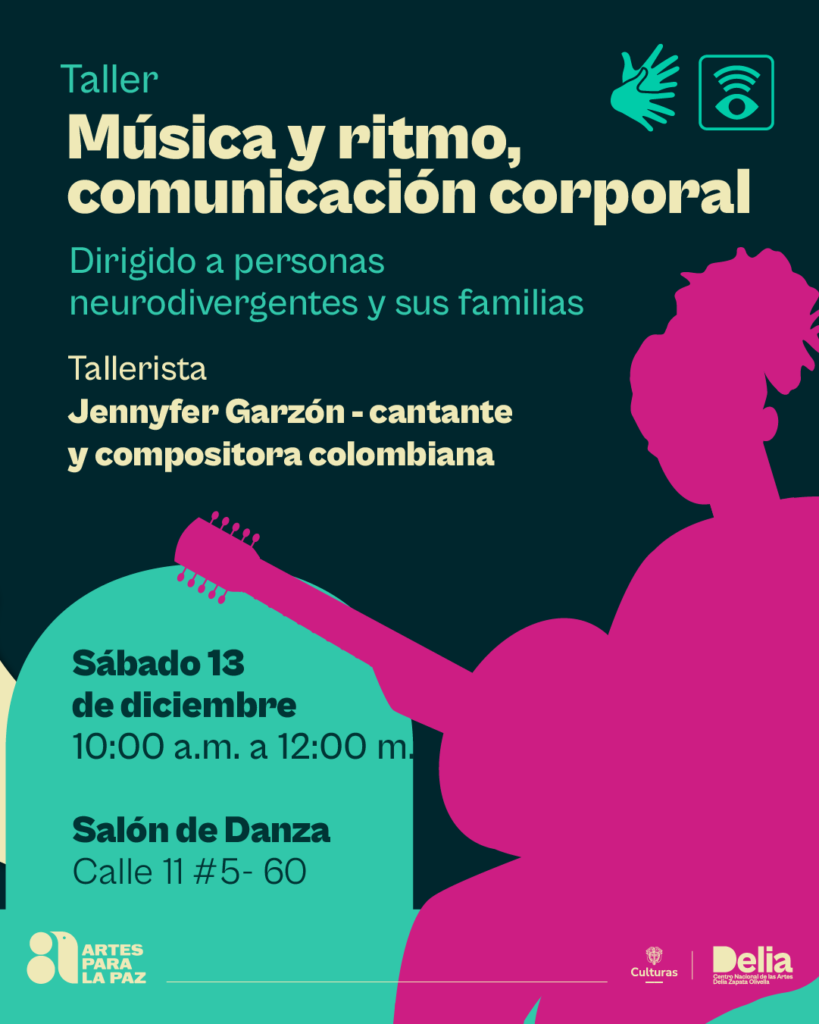 Para personas con discapacidad visual se realizará el Danza desde el sentir el sábado 13 de diciembre, dirigido por la tallerista y artista multidisciplinar, María Alejandra López y para población sorda se realizará el Taller de vídeo poesía en Lengua de Señas Colombiana el viernes 12 de diciembre, dirigido por Joaquín José Hernández, director del Festival Colombiano de Cine Sordo Fecisor. También se realizará el taller ‘Música y ritmo, comunicación corporal’ para personas neurodivergentes y sus familias, realizado por Jennyfer Garzón, cantante y compositora colombiana.