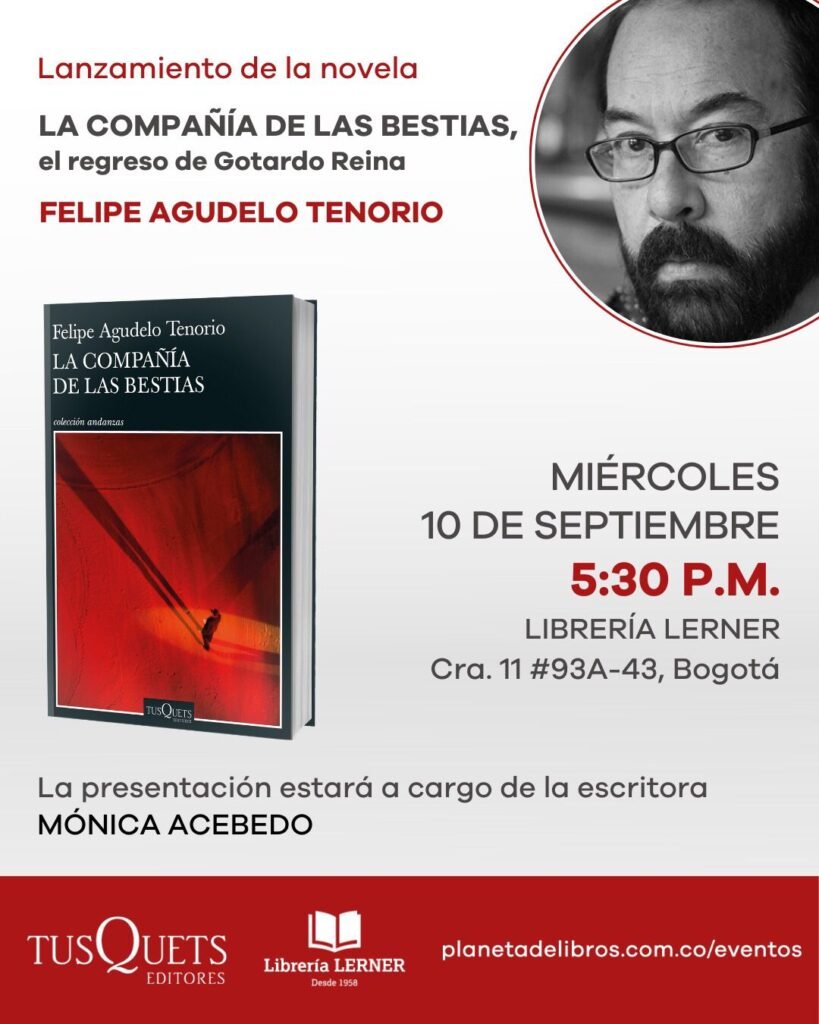Muy pronto, los lectores y escuchas de Cooltura Total podrán disfrutar de una nueva conversación con Felipe Agudelo. Por lo pronto, los invitamos a asistir a la presentación de La compañía de las bestias, que hará el escritor junto a la también escritora Mónica Acebedo el miércoles 10 de septiembre a partir de las 5:30 de la tarde en la Librería Lerner sede norte: Carrera 11 # 93A – 43, Bogotá.