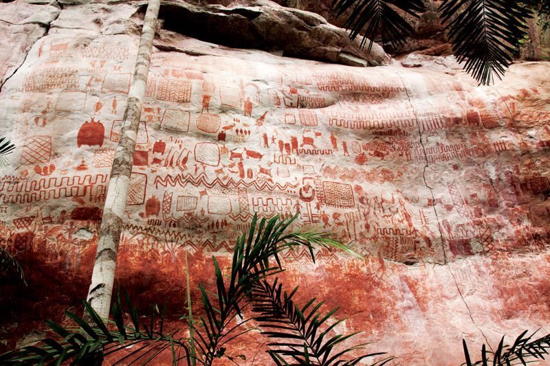 En la serranía La Lindosa, ubicada en el departamento del Guaviare, Colombia, estas pinturas son un sistema simbólico de asombroso valor histórico, patrimonial y cultural. En las paredes de los abrigos rocosos se representan escenas de danza, pesca o cacería, pero también formas de objetos y figuras de animales, cuerpos humanos, tramas geométricas, manos, líneas y espirales que componen un lenguaje visual que revive las historias y vivencias de nuestros antepasados.