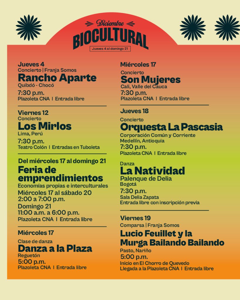 Del 12 al 21 de diciembre, Los Mirlos, Los Melódicos, un homenaje a Lucho Bermúdez de Adriana Lucía y su Big Band, la Orquesta La Pascasia, Lucio Feuillet y la Murga Bailando Bailando, El Palenque de Delia, Son Mujeres y los picoteros Mily Iriarte y Monosóniko son las agrupaciones invitadas a las fiestas decembrinas en el Centro Nacional de las Artes. Diciembre Biocultural contiene una programación que explora cómo territorio, memoria, ecosistema y creación se unen en prácticas artísticas que sostienen la vida cultural del país y de la región. La programación también incluye una feria de emprendimientos y danza a la plaza