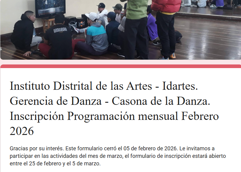 Finalmente, como las inscripciones para participar en este taller se encuentran cerradas, el Idartes y la Casona de la Danza invitan al público interesado a permanecer atento a las inscripciones para los talleres de danza de marzo, las cuales estarán abiertas entre el 25 de febrero y el 5 de marzo.